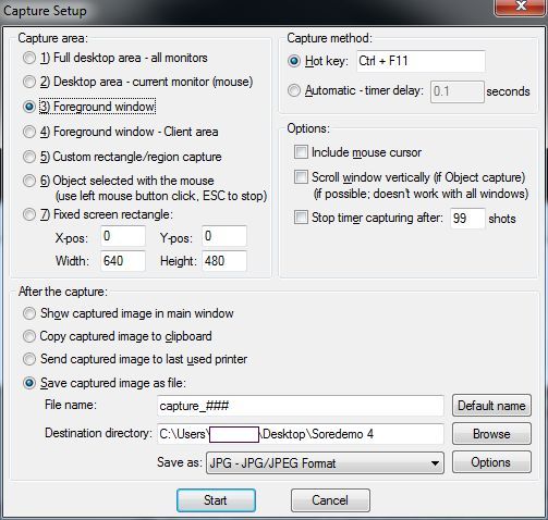 Leave the capture method as hotkey, and in the After the Capture section select Save captured image as file and select a folder for it to go in (IrfanView will create this directory if it doesn’t exist). Then hit Start.