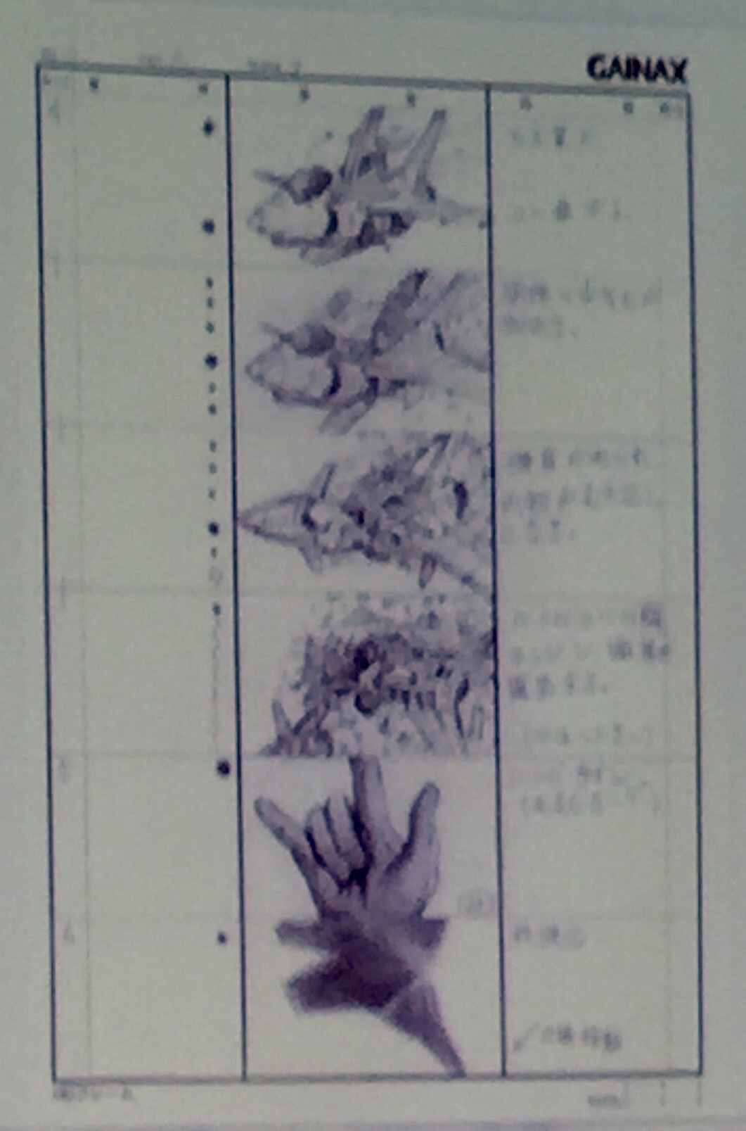 Aside: all art shown (except possibly the Sadamoto piece above) are from the rebooted project. Mecha design for the protagonist’s jet is by Masamune Shirow (yes, that Shirow – the one who created Ghost in the Shell. Apparently he still does some work aside from porn…). Storyboards such as the one below were drawn by Yamaga. Yamaga is also working with Sadamoto to refine character designs.