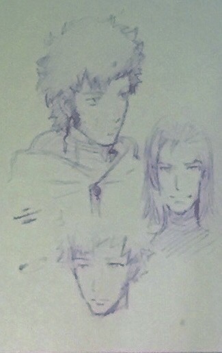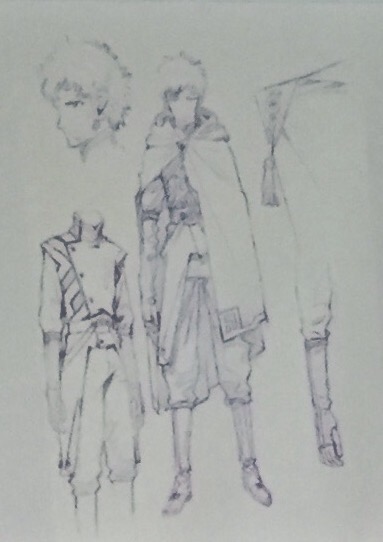 In terms of character design Yamaga wanted the lead to have a distinctive appearance, thus his hair and sword (the latter designed by Yamaga). Yamaga drew some further (for example, the dueling opponent) maybe 2 days before Fanime and is still unsure about the design. The (currently-long-haired) is sort of the opposite of the protagonist, having grown up rich.